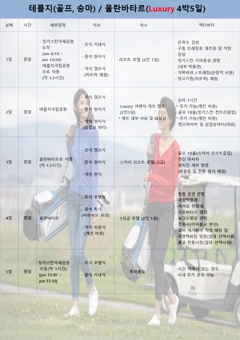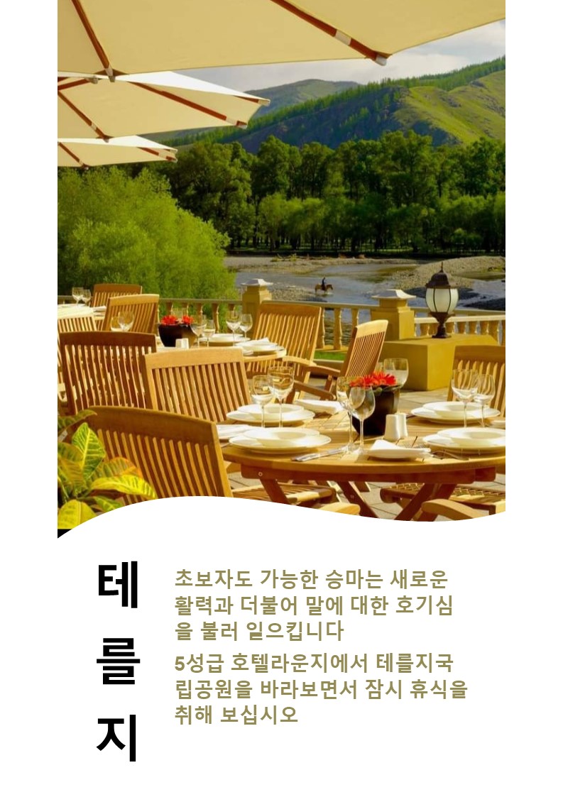④ 전 일정 4-5성급 호텔 및 여행자게르 캠프 / 스타렉스 차량(냉장고 및 에어컨, 캠핑용품 갖춘 깨끗한 차량) / 승마 및 낙타 / 전 일정 식사 / 야외 삼겹살 파티 등 포함입니다