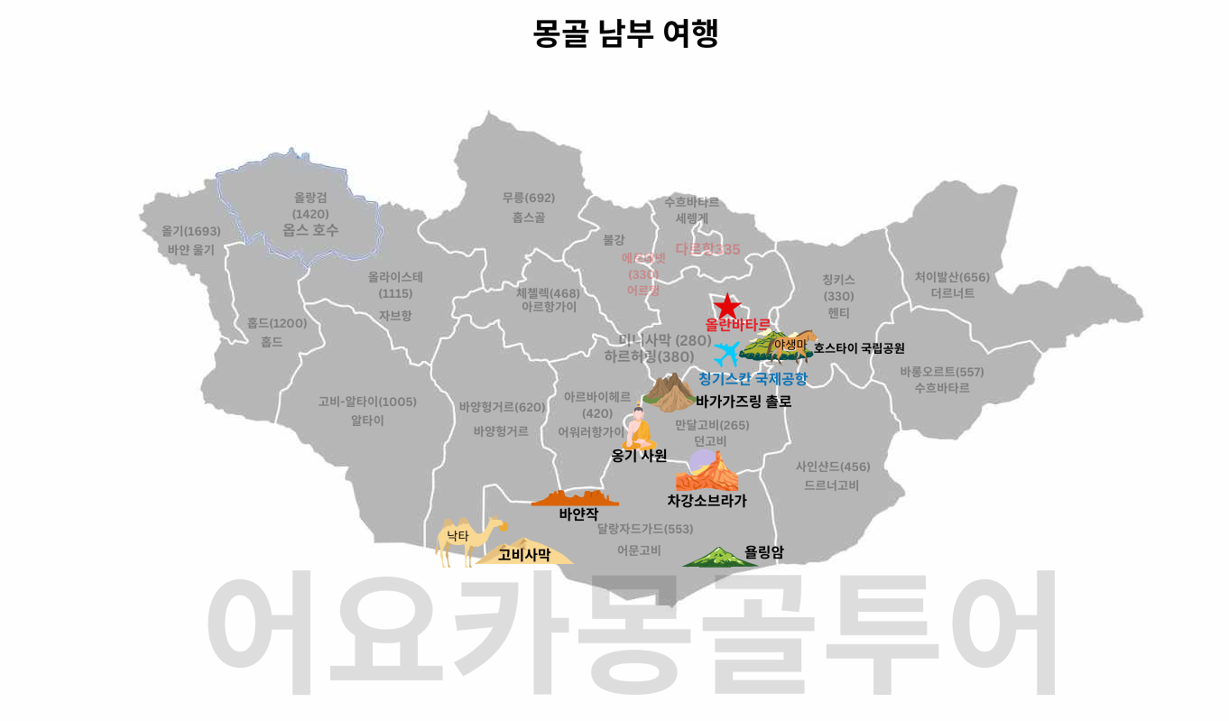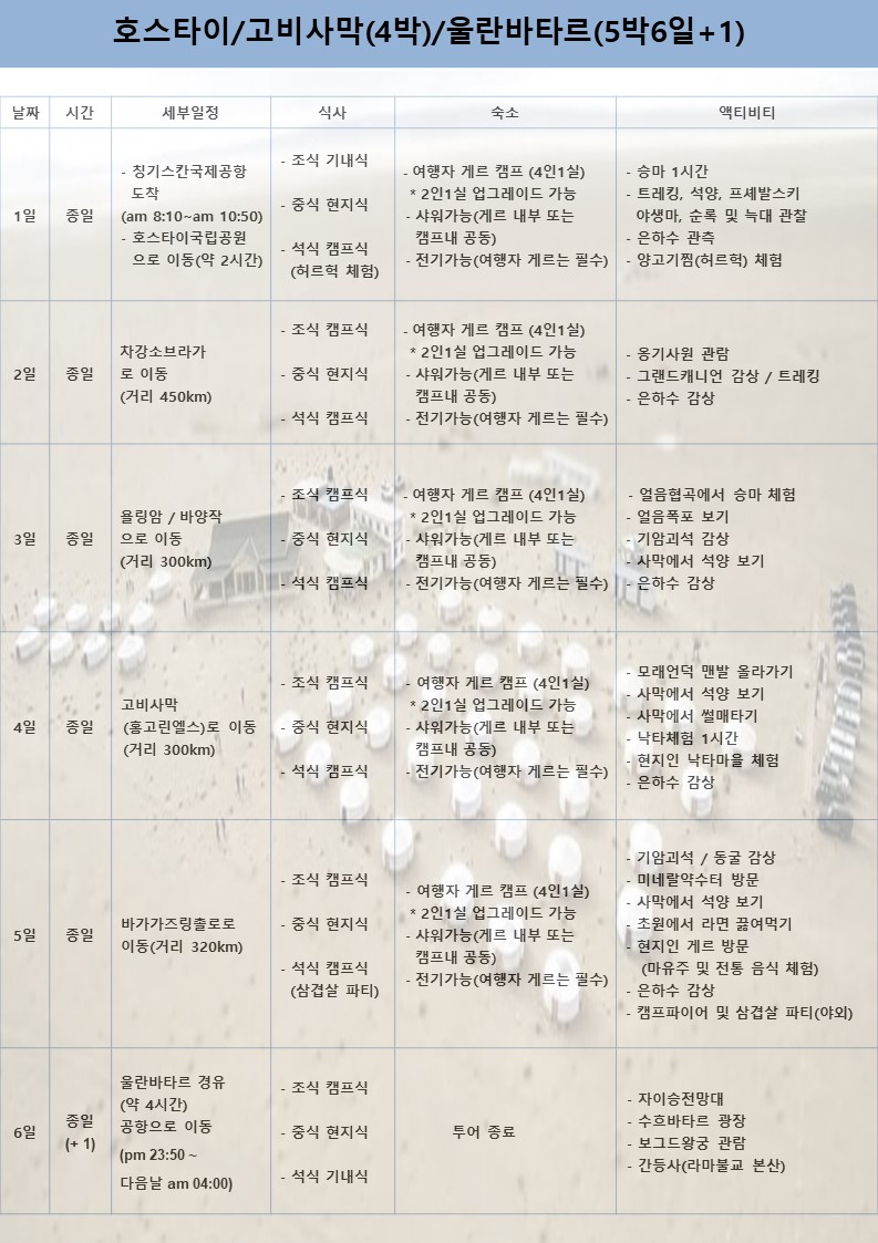 ① 고비사막을 포함하여 몽골 남부 주요지역을 알차게 즐길 수 있는 풀패키지 상품입니다(항공권 개별구입시 별도 문의)
