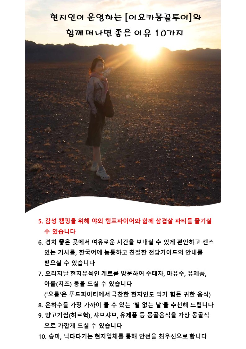 ② 【어요카몽골투어】는 몽골의 모든 여행상품을 여행자 니즈에 맞게 설계해 드리는, 몽골전문의 맞춤식 여행사입니다